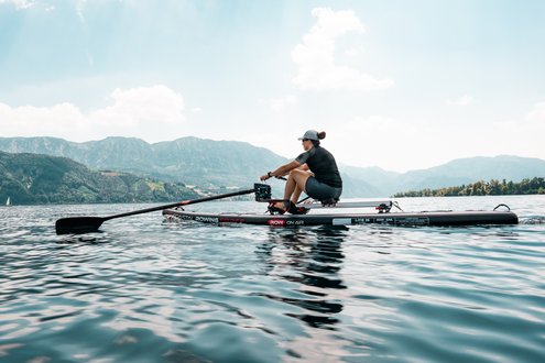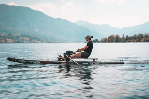 An den vormontierten D-Ringen einhaken und den Gurt festziehen, um das RowVista® oder RowMotion® Rowing Skid am LITE 15 zu befestigen.