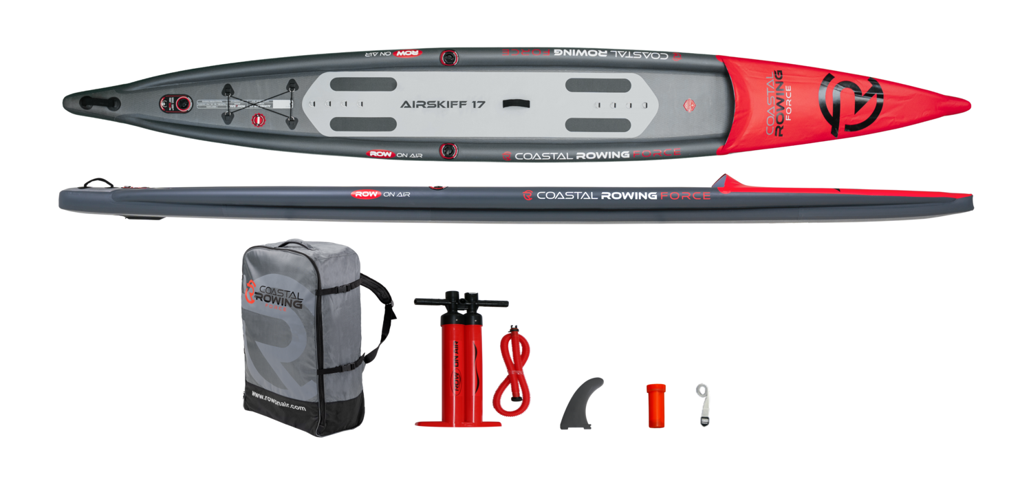 Inflatable AIRSKIFF 17 • backpack with wheels • pump • 1 fin • repair kit • wind shield • strap