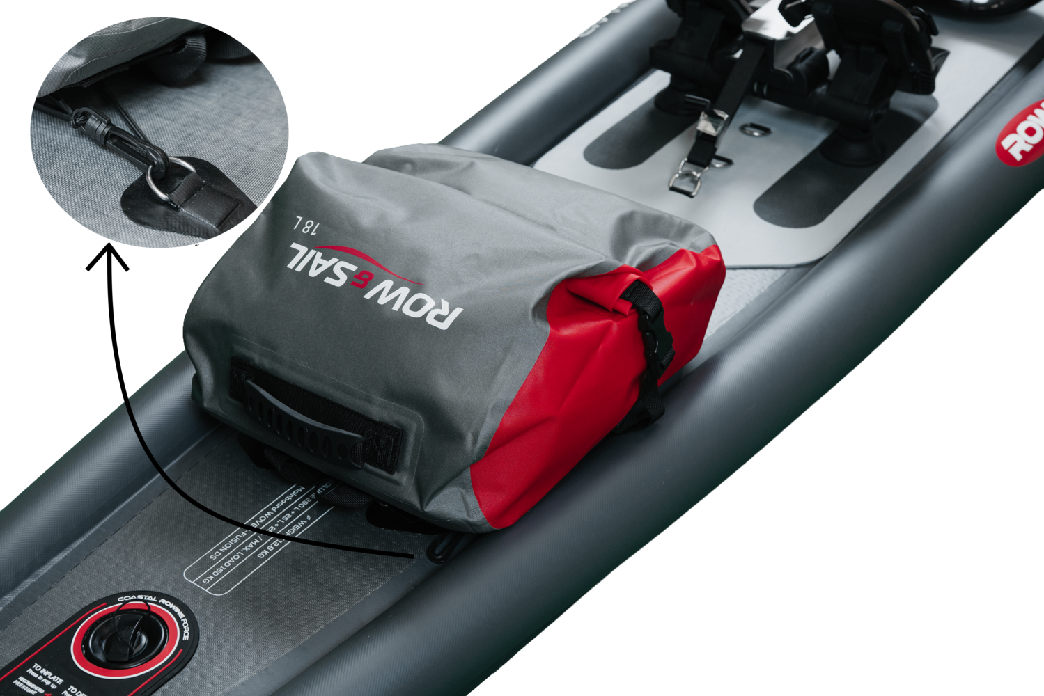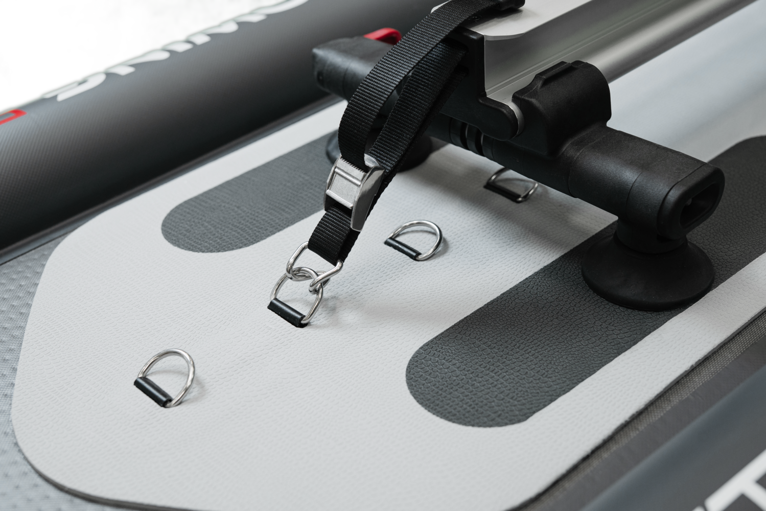 Hook up to the pre-mounted D-rings and tighten the belt to attach the RowVista® or RowMotion® Rowing Skid to the AIRSKIFF 17.